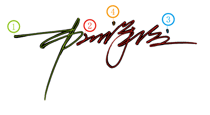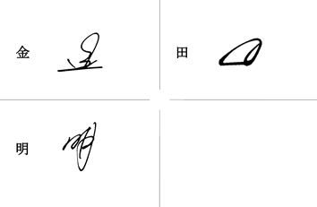 在分析文字後,決定采用放大【由】字體的方式來進行設計。 簽名水平用條右上傾斜的直線來貫穿全體,圍繞該直線,用圓弧線條串聯的方式以體現簽名的整體感。【由】意外的【塩】【由】【之】三個字在直線和圓弧筆畫上各取所需搭配。整款微微右傾給人給人以動感,文字筆畫最多的【塩】字大幅度簡化筆畫,和其他3文字協調,也大大的節省了書寫時間。