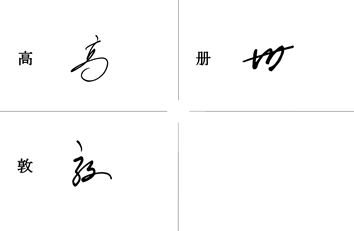 這個是以曲綫為主,講究空間佈局的典型代表設計。簽名設計整體故意構架成不安定的右上延升的結構,讓原文委婉柔和的曲綫呈現出種銳利的氣勢。最後利用【敦】字的最後一筆左側回收,這樣既能在書寫上起到畫龍點睛完美收筆,更重要的是補足了右下的空間空白,一下子使設計整體安定穩重下來了。